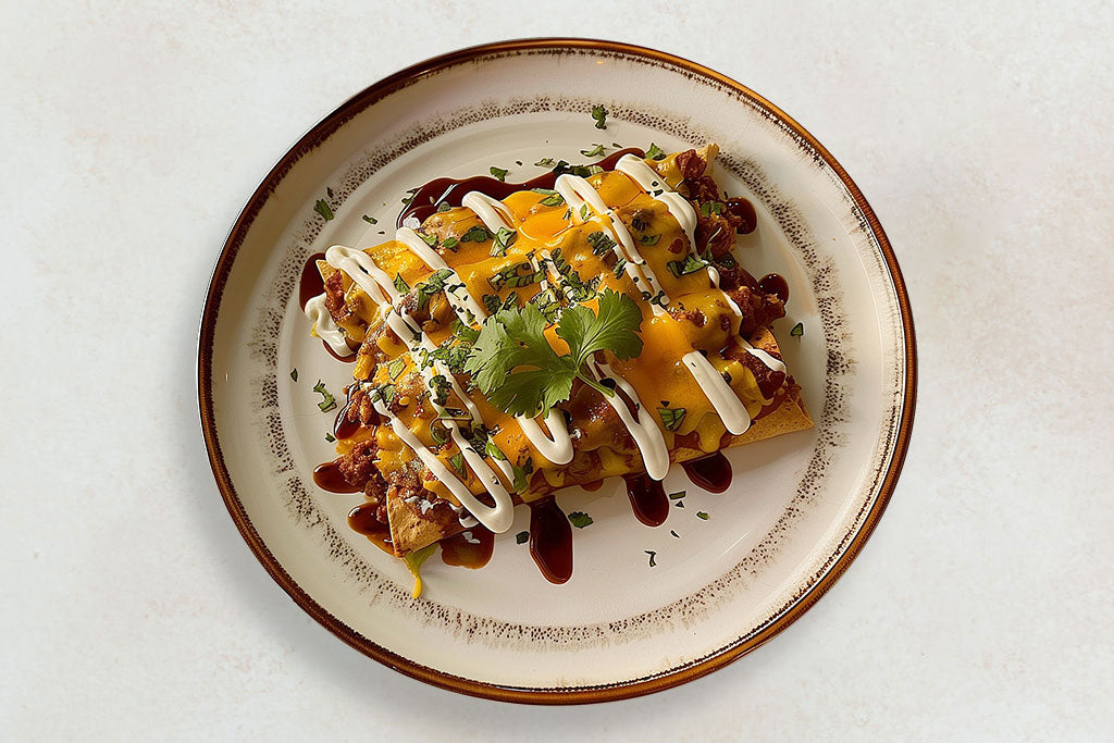 Tender and succulent barbacoa beef wrapped in corn tortilla with black beans, corn, olives, reduced-fat cheddar and cotija cheeses, and drizzled with our house-made lime crema sauce and cilantro.