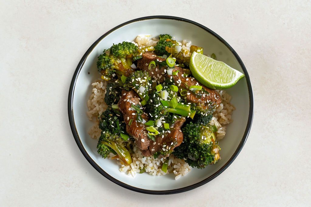 A fit stir-fry of Angus sirloin and broccoli, served over brown rice with a sprinkling of scallions and sesame seeds.