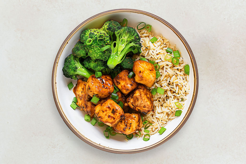 A Chinese chef working on New Orleans’ famous Bourbon Street invented this dish of chicken marinated in garlic, ginger, apple cider, tamari and bourbon. Here’s our deliciously fit version served with sides of brown rice and broccoli.