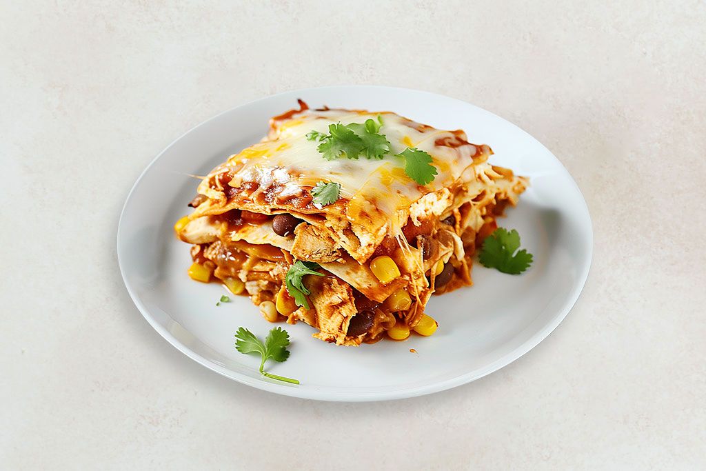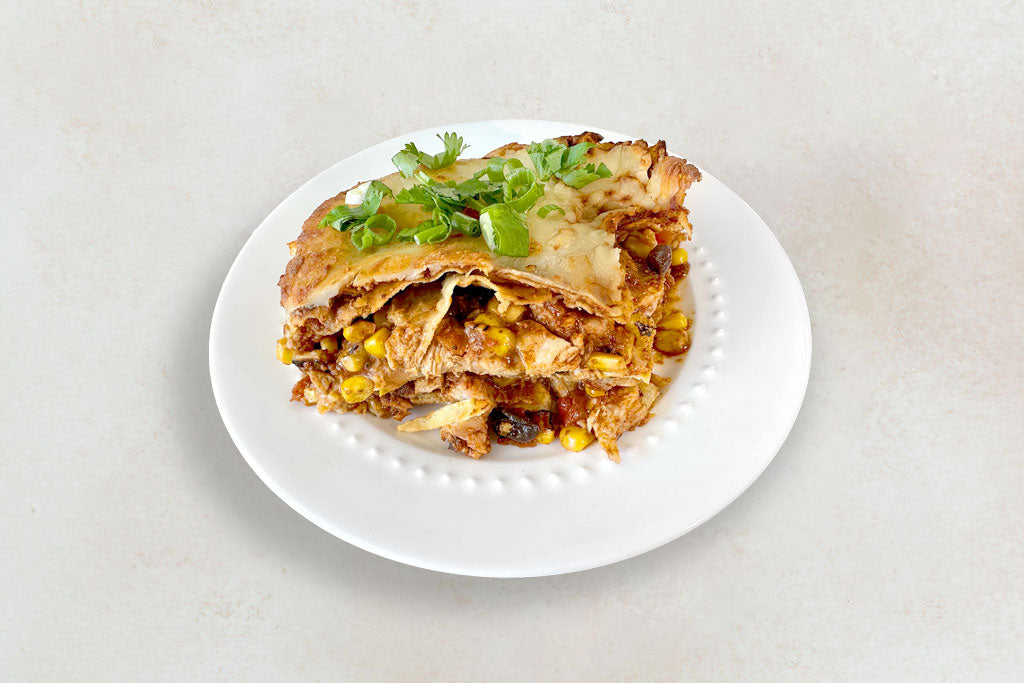 Layered Gluten-free corn tortillas, kidney and black beans, corn and marinated all natural antibiotic-free shredded chicken all baked together and topped with mozzarella cheese.