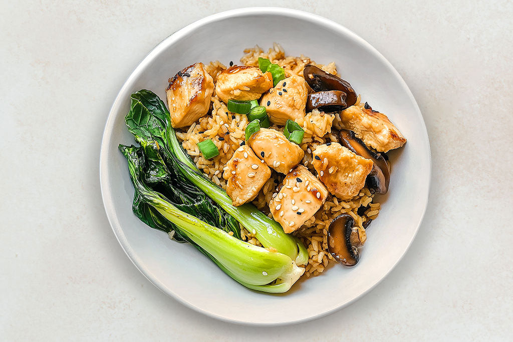 A not-so-fried version of tamari-marinated chicken with brown rice, eggs, shitake mushrooms, bok choy and sesame seeds.