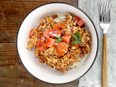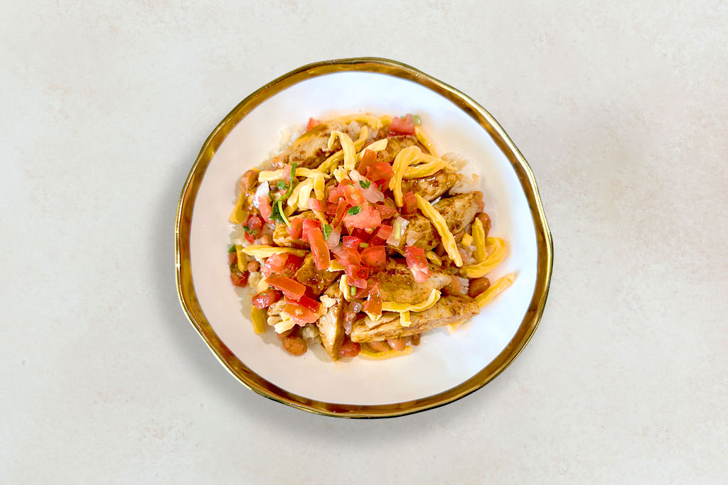 Product Shredded all natural antibiotic-free chicken breast tossed in a house made red enchilada sauce. Served over brown rice, pinto beans and reduced fat cheddar cheese. Pico de gallo is served on the side.