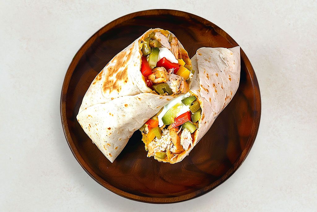 All natural chicken breast served inside an organic whole wheat tortilla with saut̩eed bell peppers, onions, low fat cheddar cheese and a pinto bean pur̩e.