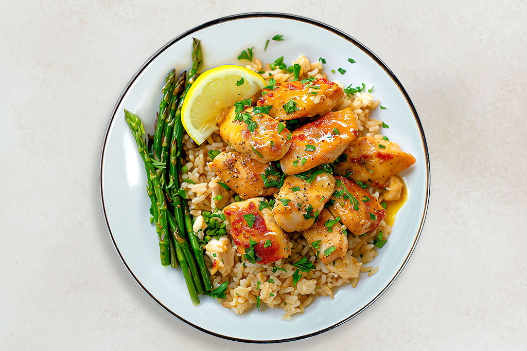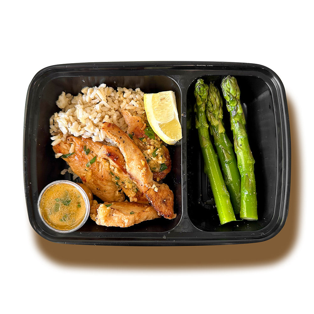 Tasty chicken tenderloin bites, cooked in garlic butter and spices, served with a seasonal vegetable, brown rice and extra garlic butter sauce.