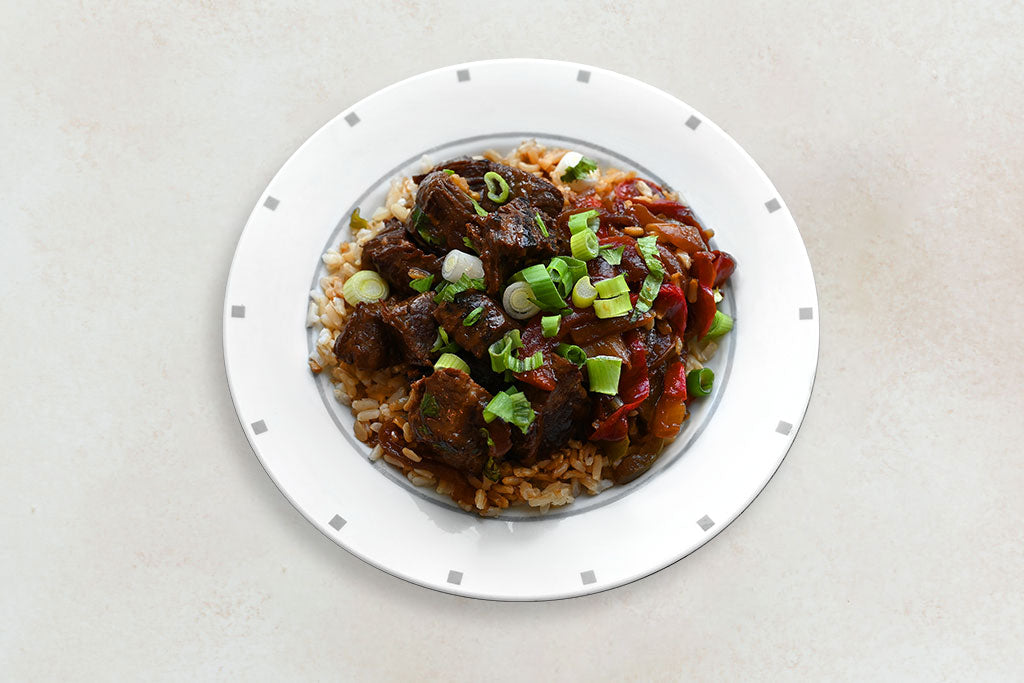 Tasty, hoisin-marinated, Angus flank steak with onions, bell peppers and brown rice, garnished with cilantro and scallions, and served with our delicious, house-made, hoisin steak sauce.
