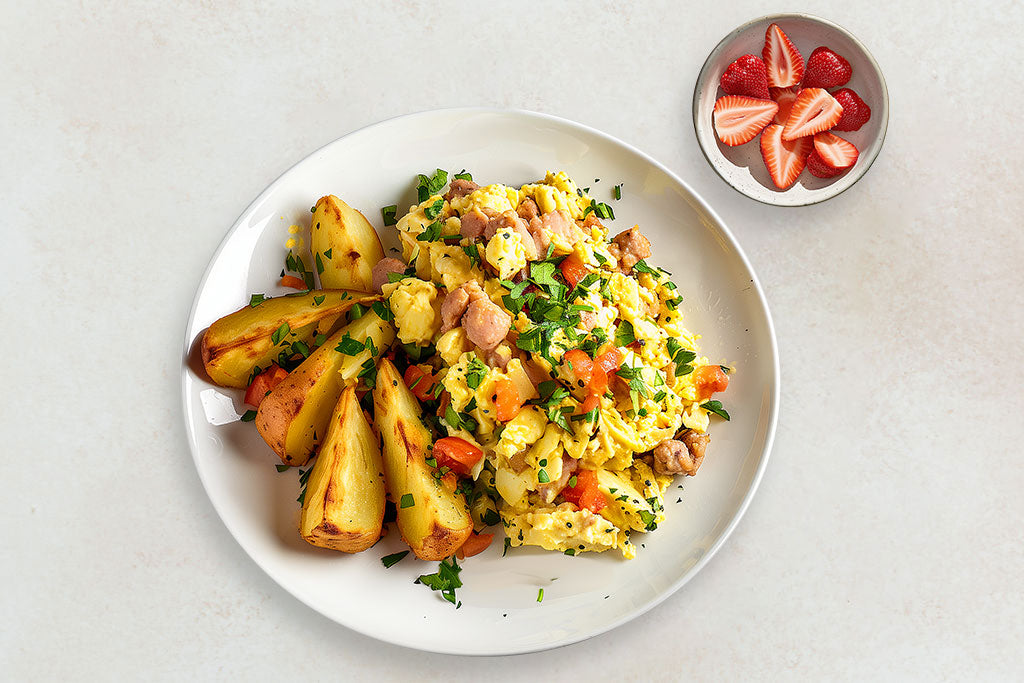 Our famed low-carb, meaty scramble of 3:1 egg white to egg ratio with turkey sausage and bits of bacon, served with rosemary fingerling potatoes and a side seasonal fruit.