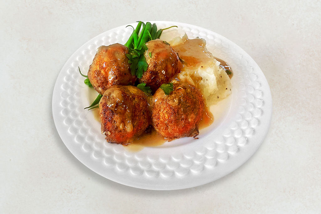 A low-carb, keto dish of turkey meatballs in a tasty Swedish-style sauce with cauliflower mash and haricot verts